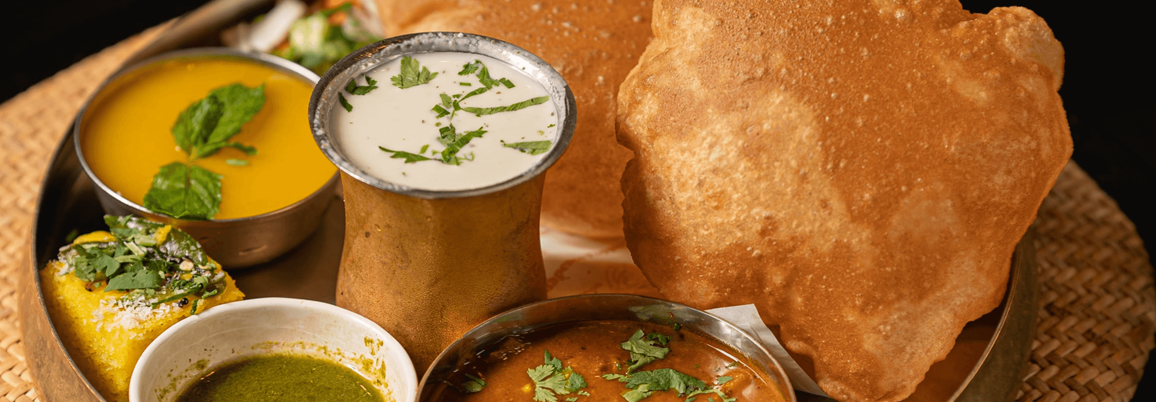 Golden puris served with silky aamras, spicy aloo sabji, khaman, and fresh salad. A wholesome feast with sweet and spicy flavours in every bite.